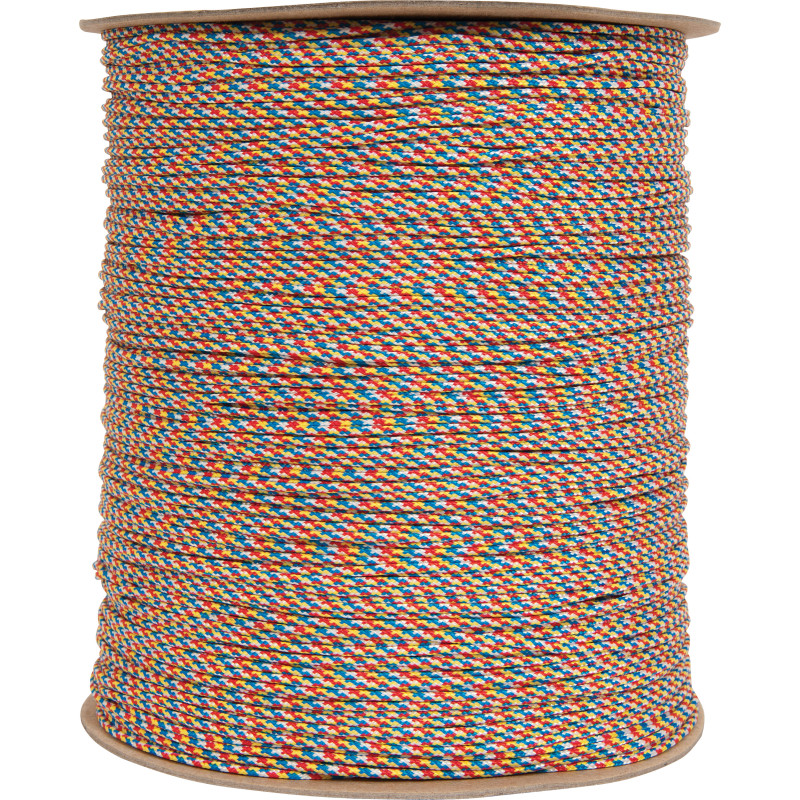 This rainbow cord is ideal for tent guy lines, clotheslines and many other tasks. Kernmantle construction for high strength and low stretch. 350 lb strength rating. 1/8" (3mm). Made in the USA.
