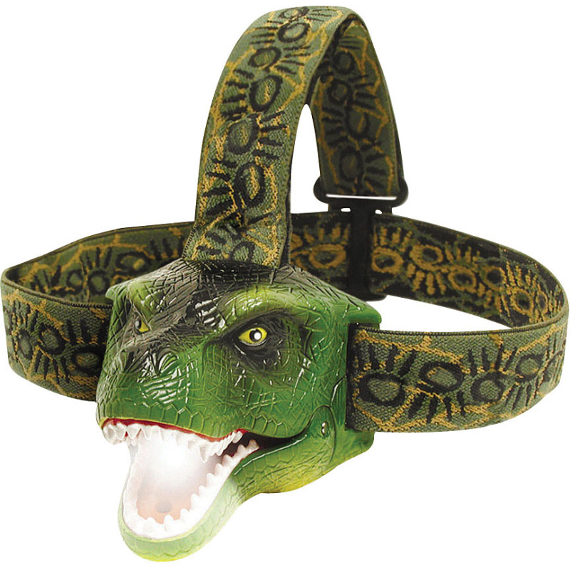 The light with the bite LED Headlamp. Roars three times when light turned on. Close mouth for ON-OFF. Includes master ON-TEST-OFF switch. Adjustable elastic straps. Super bright white LED powered by 3 replaceable AAA batteries (included). LED protected by focusing lens. Ages 6 and up. Perfect for reading, camping, and safety. 2.8"x 2.7" x 2.9". Weight: 4.2 oz.