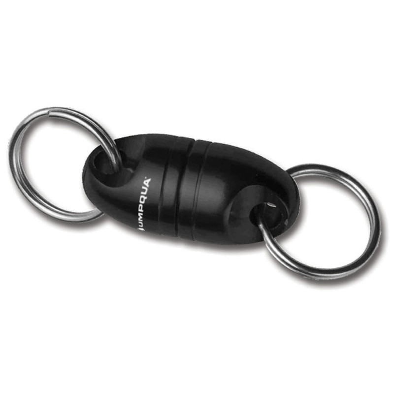 Umpqua Magnetic Net Holder and Release. Hold your net securely and access easily! Give a firm tug on your net to separate the two strong magnets,and you\'re good! Carabiner clips to the D-ring on your vest while using a split ring to attach to your lanyard/net.