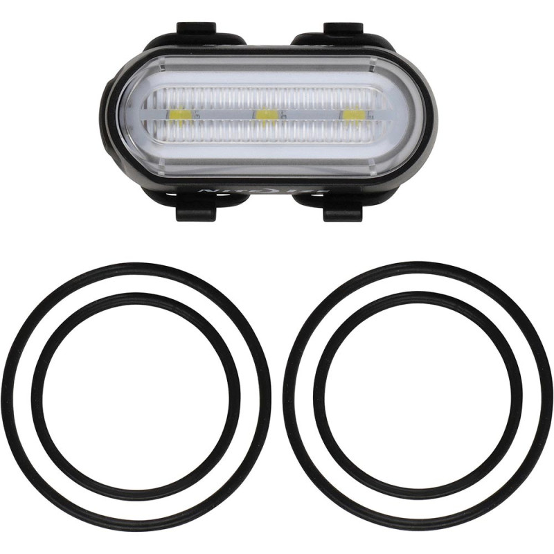 This light is available in red or white, has curved back with grippy rubber, and comes with two sets of attachment bands so it can be mounted horizontally or vertically in a variety of places on a bike. It is an ideal from or rear indicator light to make riders seen and safe.