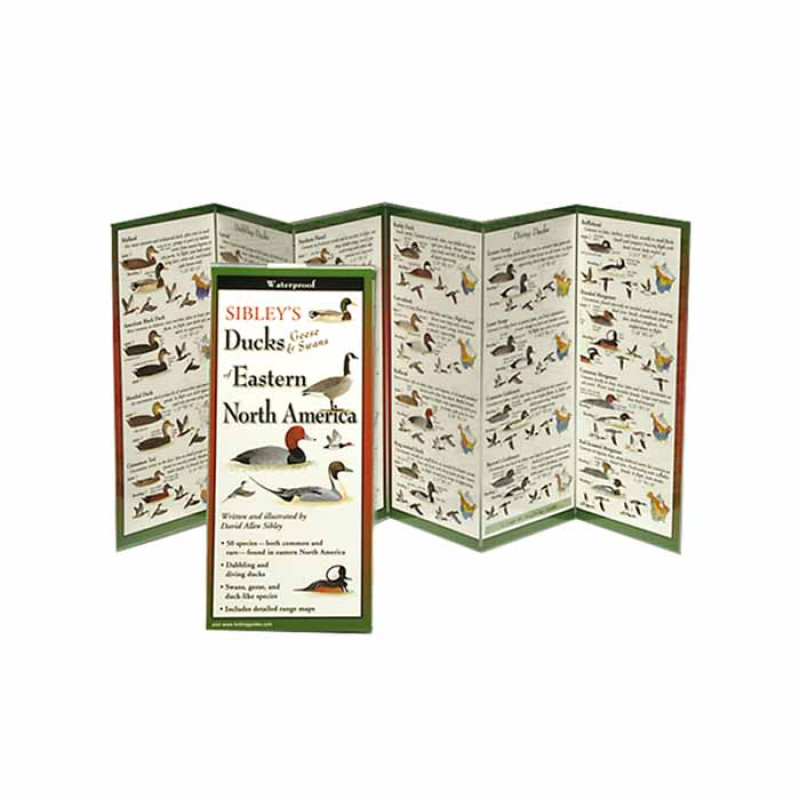 Written and illustrated by David Allen Sibley, Americaâs most widely respected bird illustrator and ornithologist. 46 waterbirds birds are covered: dabbling ducks, diving ducks, geese, swan, and other domestic waterfowl. Each entry includes descriptive caption, size, range map, seasonal occurrence, and multiple illustrations, all taken from the award-winning The Sibley Guide to Birds, 2nd Edition. Handy fold-out format: 6 panels each 4? X 9?. Perfect for backpack, glove compartment, or kitchen table Indestructible waterproof lamination Instant access to just what you need to know