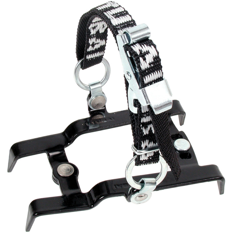 Great for getting grip to your feet fast. This four point crampon is made of hardened steel and a strap binding that fits all boots.