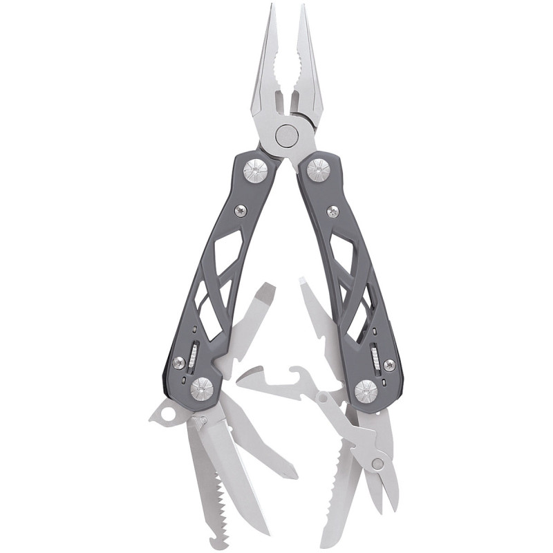 Spring-loaded pliers. Patented Saf.T.Plus. Open frame design. Components: Needle-nose pliers, wire cutter, fine edge knife, serrated edge knife, saw, scissors, crosspoint screwdriver, small and medium flatblade screwdrivers, can opener, bottle opener and lanyard hole. Stainless steel handle. Ballistic nylon sheath.